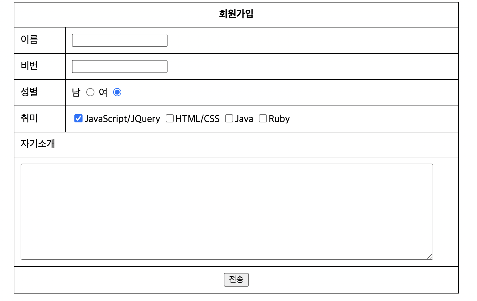 Table 태그 - thead, tbody, tfoot , , 태그는 각 각 머리글, 본문, 바닥 글을 의미 합니다. 테이블의 내용이 많을 때 와 는 머리글과 바닥 글을 고정시켜 놓는 요소로 사용합니다. 이 요소들은 테이블의 레이아웃에 영향을 미치지 않습니다. 하지만 CSS를 사용하여 디자인의 스타일을 지정할 수 있습니다. 회원가입 이름 비번 성별 남 여 취미 JavaScript/JQuery HTML/CSS Java Ruby 자기소개 HTML&CSS 2021.04.08