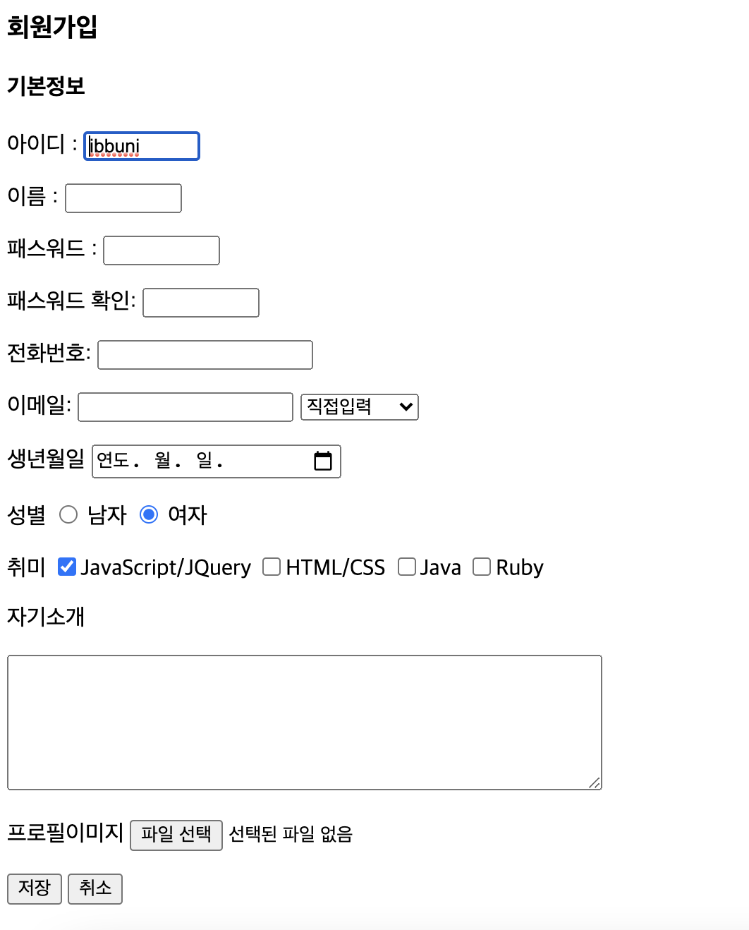 Form 태그 회원가입 기본정보 아이디 : 이름 : 패스워드 : 패스워드 확인: 전화번호: 이메일: 직접입력 daum.net gmail.com naver.com 생년월일 성별 남자 여자 취미 JavaScript/JQuery HTML/CSS Java Ruby 자기소개 프로필이미지 취소 Type 설명 text 입력한 text를 그대로 표현해주는 form password 마스크 처리된 text form textarea 여러 줄의 text를 입력할 수 있는 form search 검색 창으로 사용할 수 있는 form date 날짜를 입력할 때 사용할 수 있는 form time 시간을 입력할 때 사용할 수 있는 form range 슬라이드 바 형식의 form number 수를 선택할 수 있는 하는 form color 색을 선택할.. HTML&CSS 2021.04.08
